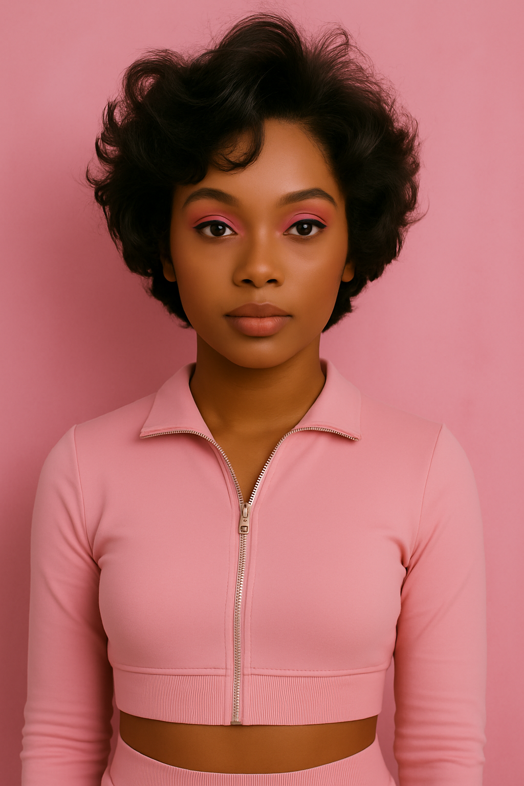 Dans sa version noir profond, Sysley conserve sa coupe courte bouclée et volumineuse mais gagne en intensité.